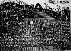 Throughout Brazil's poor Northeast ("Sertão"), itinerant peddlers sell home-made illustrated chapbooks addressing popular themes, folktales and legends. This unique art form - "Literatura de Cordel" (string literature) - consists of written verses and woodblock prints illustrating the rhymed stories. Traditionally, the "cordel" booklets were sold at country fairs or popular rural markets where they hung from a piece of string or clothesline. These long, narrative poems with their woodcut illustrations on the cover, were sung out loud to a mostly illiterate rural population. The traditional themes (romances, fantastic stories, animal fables, religious traditions) and themes based on current events, famous people or politicians, can be hilarious, romantic, satirical, and even racy. These days cordel booklets are also sold in Brazil’s big cities where much of the rural population of the Sertão (outback) has migrated. At the same time, woodblock prints illustrating the booklets have been produced in larger formats and are sold separately, often to collectors. On rare occasions the woodblocks themselves are sold.